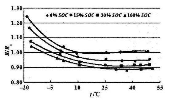 鋰電池溫度與電阻的關(guān)系,如下圖所示。不同的曲線代表電池自身不同的荷電量。任何一個(gè)荷電量下,電池內(nèi)阻都隨著溫度的降低而明顯升高,荷電量越低的電芯,內(nèi)阻越大,并且這個(gè)趨勢也隨著溫度的變化而保持不變。